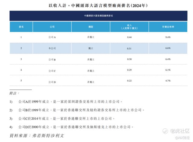 智谱AI在招股书中援引了咨询公司弗若斯特沙利文出具的一份榜单:按2024年收入,智谱AI以3.1亿元的收入、6.6%的份额,位列中国大模型厂商第二,仅次于科大讯飞,力压阿里、百度(公司名称根据招股书推断)。按此报告,智谱AI是中国最大的独立大模型厂商。