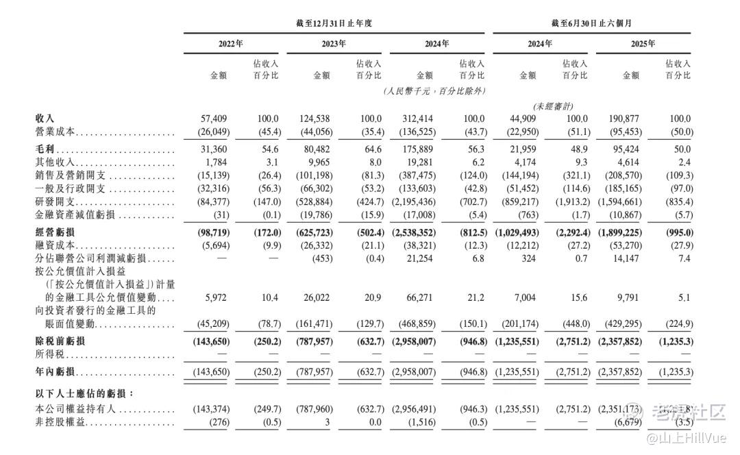 从 2022 年至 2025 年上半年,三年半智谱累计收入不过 6.85 亿元,同期累计亏损则超 62 亿元。亏损占收入比重从 2022 年的 250.2% 一路走高至今年上半年的 1235.3%。
