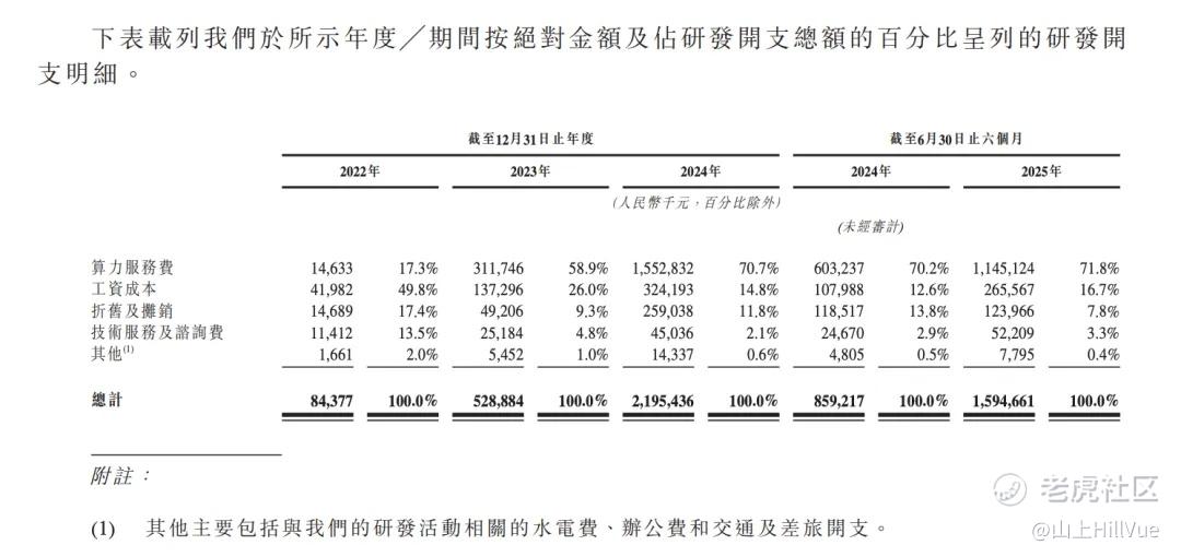 但人才成本并不是智谱研发开支的大头。事实上,智谱的大多数研发开支都用在了算力消耗上,去年工资成本仅占研发开支的 14.8%。2024 年及 2025 年上半年,超 7 成研发开支都用于算力服务费。