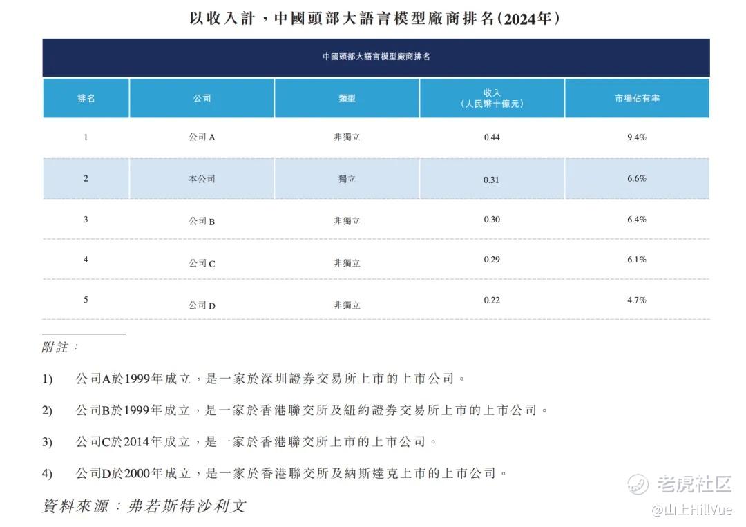 智谱在招股书中专门列出了 2024 年中国头部大模型厂商排名,除位居第二的智谱是独立大模型开发商外,其余均为科技巨头公司,如科大讯飞、阿里、商汤及百度。
