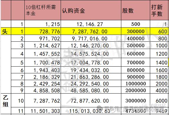 乙头需要认购资金729万,乙组的各档融资所需要的本金还有融资金额对应如下表: