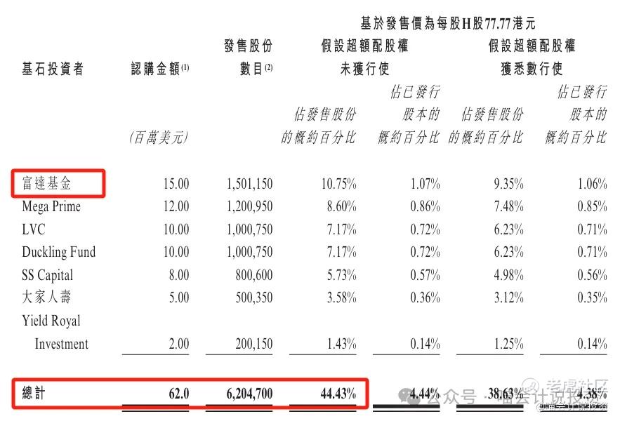 基石投资者:包括Fidelity、正心谷、大湾区等知名机构在内的7家机构合计认购44.4%
