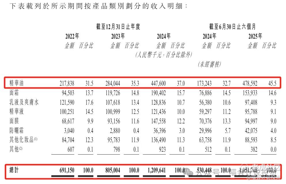 这家公司收入还是多元化的,第一名的精华油占比1/3,其他还有5个10%多一些的品类,收入结构除了2025年上半年外变化不大。