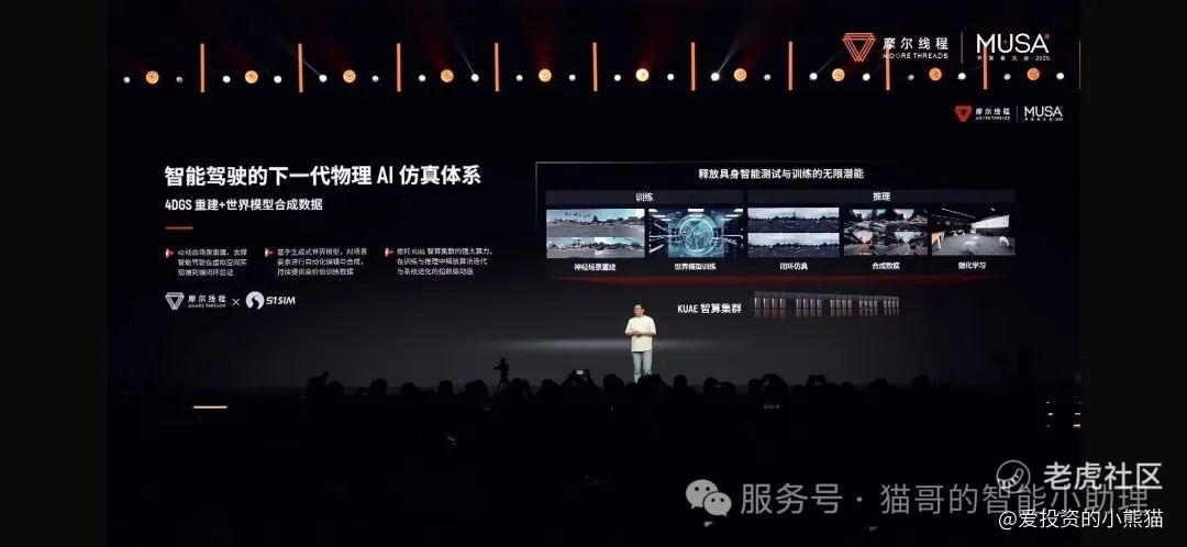 在摩尔线程创始人兼CEO张建中的主题演讲中,重点介绍了摩尔线程与 51Sim 围绕KUAE智算集群构建下一代物理 AI仿真体系的深度合作。双方以国产 GPU大规模算力为基础,以新一代仿真与世界模型技术为核心,共同探索面向端到端智能驾驶、具身智能的物理 AI 基础设施建设路径。
