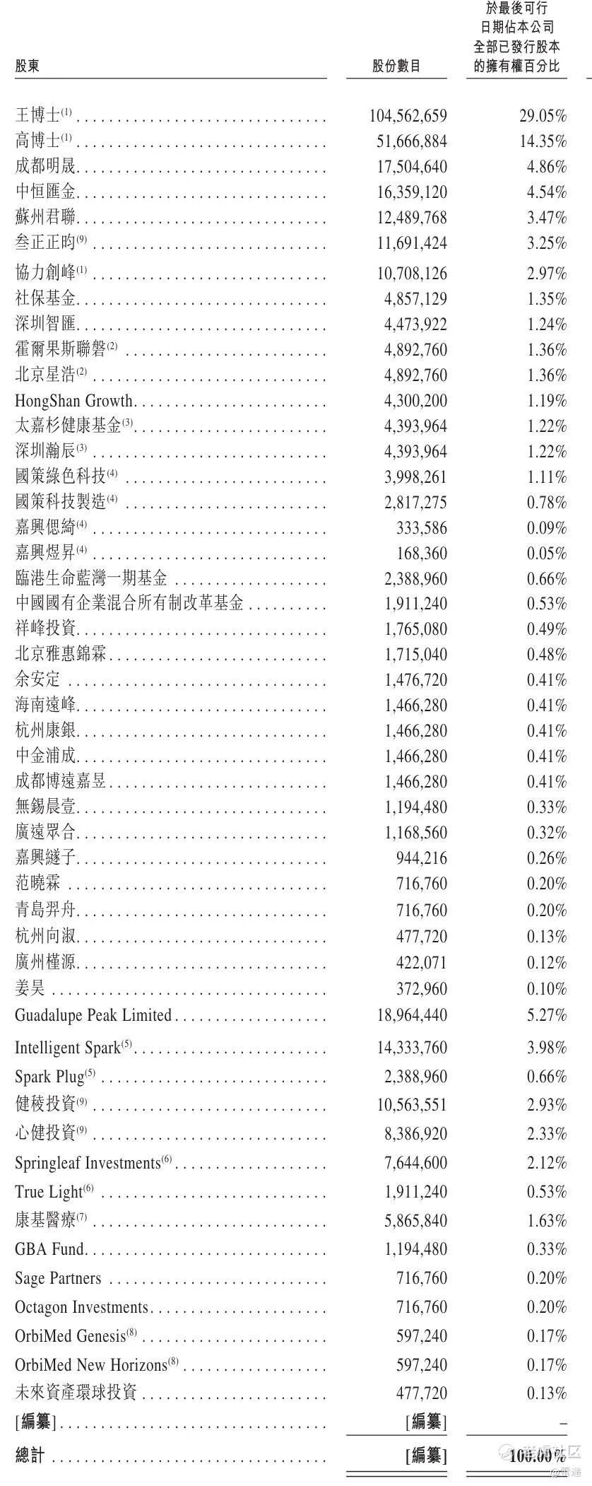 Spark Plug持股为0.66%,健棱投资持股为2.93%,心健投资持股为2.33%,Springleaf Investments持股为2.12%,True Light持股为0.53%,康基医疗持股为1.63%,GBA Fund持股为0.33%。