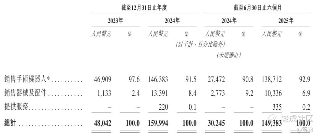 精锋医疗2025年上半年来自销售手术机器人的收入为1.39亿,占比为92.9%;来自销售器械及配件收入为1034万元,占比为6.9%。