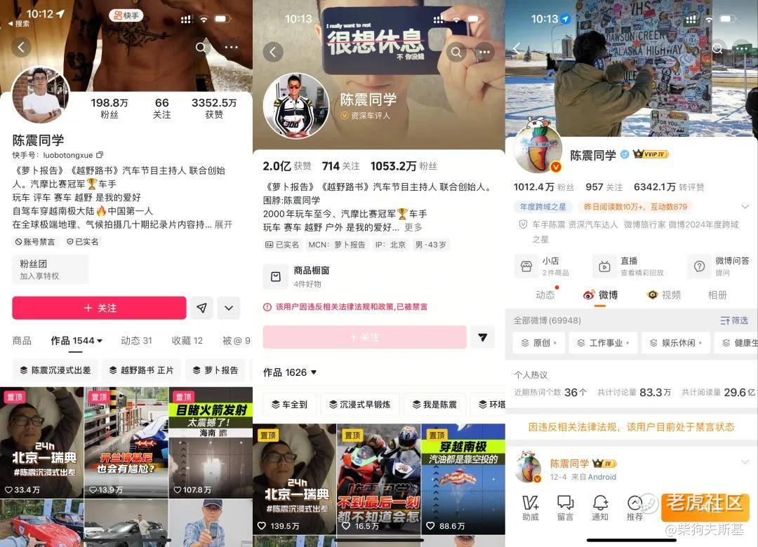 不过,抖音、快手和微博平台目前还显示禁言状态。此外,还有之前也被禁言的小号微博小号陈震同学的同学目前也是封禁状态。