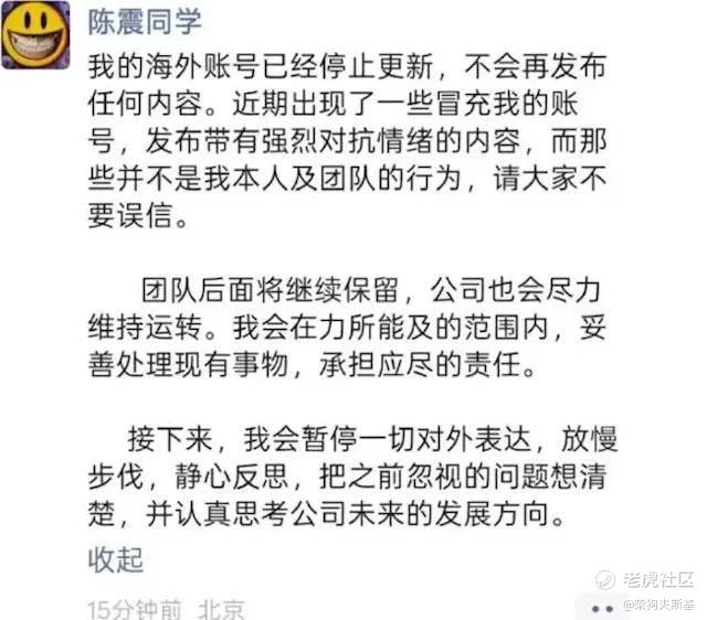 随后,陈震发文其海外社交媒体账号目前已正式停止更新,后续不会发布任何新内容。陈震最新发文:暂停一切对外表达,公司尽力维持运转……