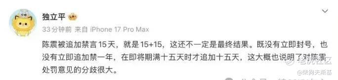 也有网友表示:陈震被追加禁言15天,就是15+15,这还不一定是最终结果……