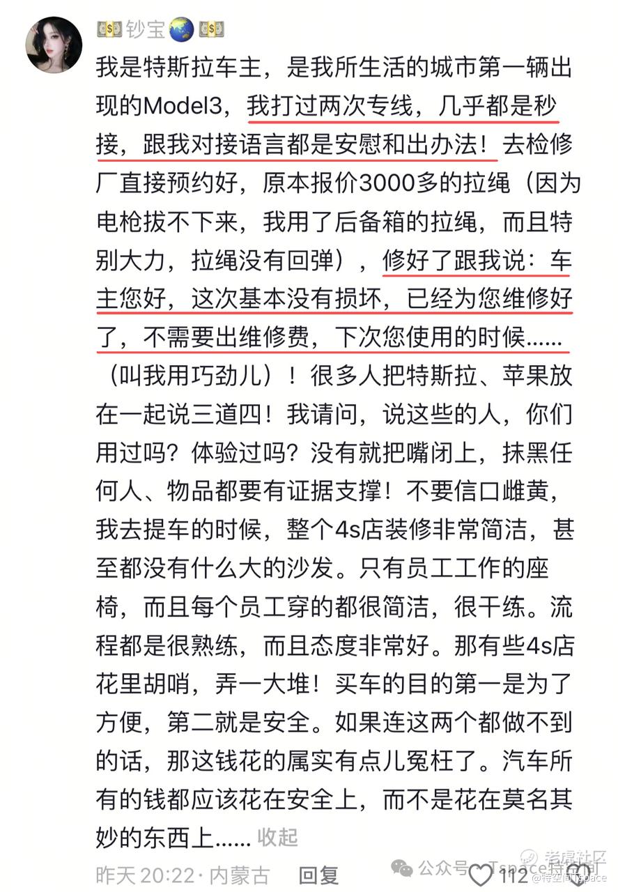 评论区里,众多特斯拉车友也分享出自己的经历。车主@钞宝 表示,自己两次拨打服务热线,电话都是瞬间接通,客服不仅耐心安抚其情绪,还迅速给出了解决方案。更惊喜的是,维修时原本预估的费用,因实际维修没产生零件替换而被免除,车主还额外获得了使用指导;
