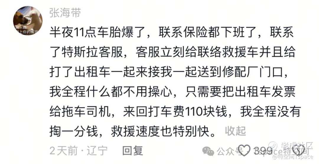车主@张海带 则讲述,自己深夜行车时遭遇爆胎,特斯拉客服第一时间安排拖车救援,协调出租车接送并主动承担全部车费。