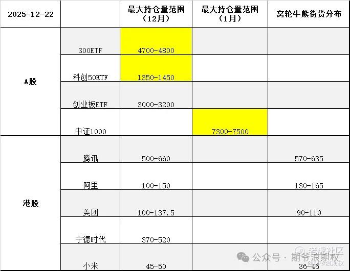 下图是今天大A的3个ETF和中证1000,以及港股的腾讯、阿里、美团、宁德和小米的最大持仓量范围以及窝轮牛熊分布范围,也就是12月的期权筹码分布,黄色的表示跟上个交易日有变动。