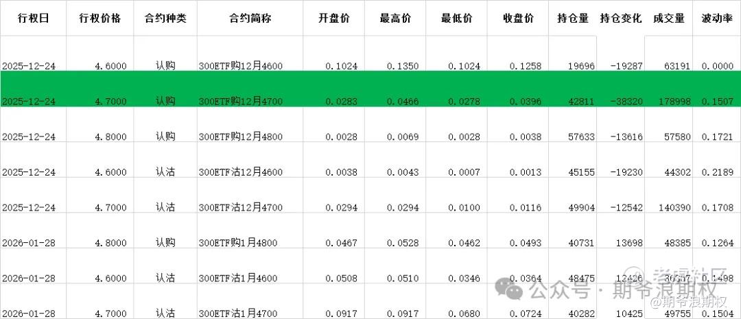 (1)沪深300ETF(沪)期权:12月最大持仓范围4700-4800,今收4.730,上涨0.90%。期权12月主力合约,认购只有5750增仓4300涨,其他行权价都是减仓,集中在4500-5000,合计,7.9W张;认沽全部都是减仓,集中在两个区域,一个集中在3423-4200,合计4.5W张,另一个集中在4600-5000,合计3.5W张。变化超过1W张的仓位如下,绿色是减仓较大的,主要是12月减仓,部分移仓到1月合约。