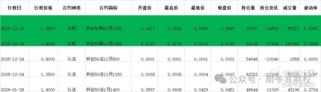 (2)科创50ETF:12月最大持仓范围1350-1450,今收1.405,上涨1.81%。期权12月主力合约,认购和认沽全部都是减仓。认购增仓集中在1200-1550,合计8.0W张;认沽以减仓为主,集中在800-1550,合计10.5W张。变化超过1W张的仓位如下,绿色是减仓较大的,主要是12月减仓,而且量特别大。