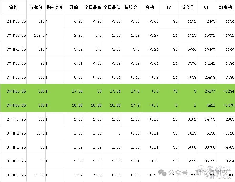 (3)美团:12月最大持仓范围100-137.5,窝轮牛熊街货分布90-110,今收102.8,上涨0.10%。期权盘路变化超过1000张的仓位如下,浅绿色是深度实值减仓,也就是说有大户准备了1.7个亿计划12月底按照120和130的价格买入美团,今天把期权仓位平掉了,放弃了原有买进股票的计划。总的来说,资金有进有出,进出基本持平。