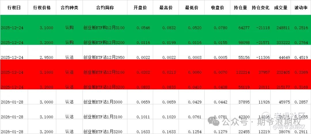 今天大A的期权成交非常热闹,基本上都是12月合约大减仓,然后部分移到1月合约。而创业板ETF大佬惯用的末日期权骚操作,今天又双叒叕地再次重复,每个月最后一两天赚1个多点,也是一个不错的现金流生意。