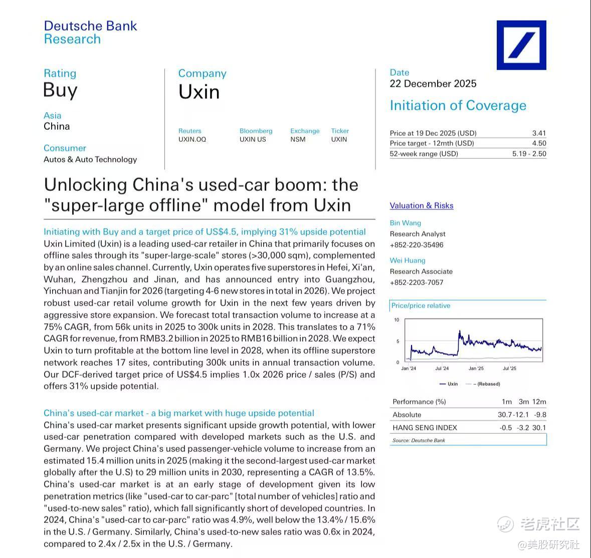 综上,德银将优信股票目标价设定为4.5美元,较当前股价存在约31%的上行空间,这反映了市场对其“超级大卖场”商业模式及未来增长潜力的认可。