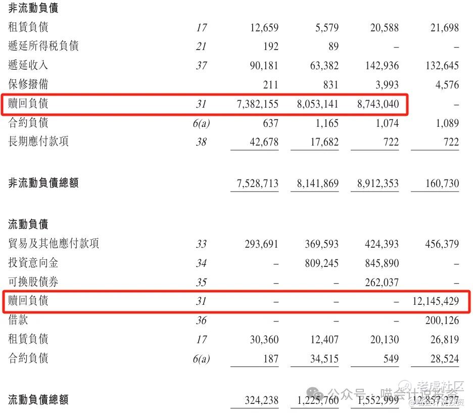 • 这7-9亿的赎回负债,到了2025年变成短期的13亿了,说明快要到期了,准则够**,反正上市之后会转入权益的。