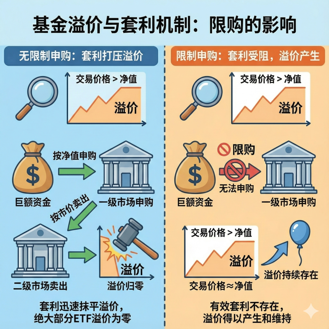如果一个基金产生了溢价,但没有限制申购,那就会有巨额资金去申购新的份额,然后直接在二级市场卖出,从而把溢价迅速打下来。
