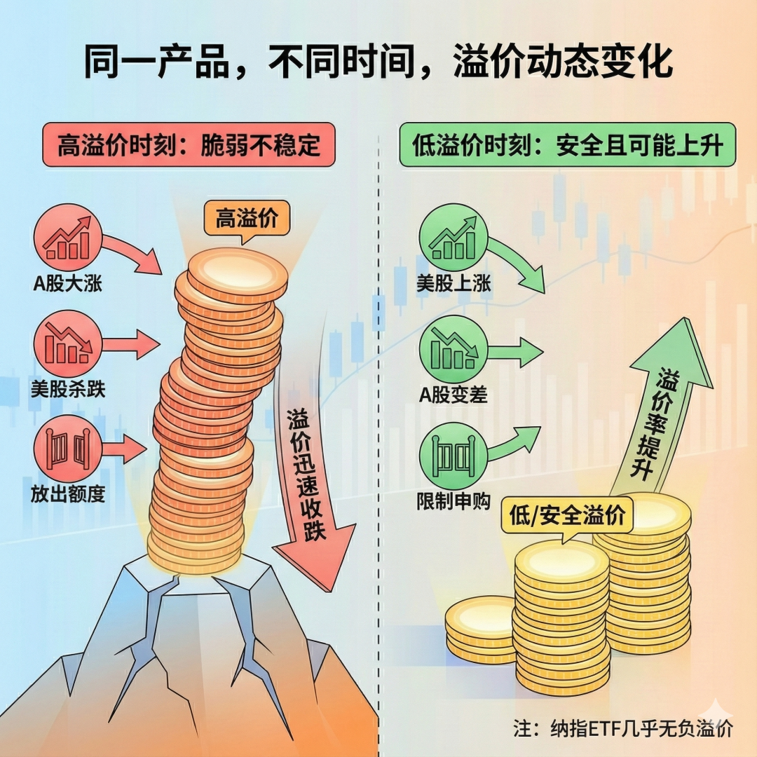 低溢价也可能变成高溢价:低溢价是安全的,以纳指ETF为例,几乎不会产生负溢价(别拿假溢价率给我看!)。但随时可能因为限制申购,美股上涨,A股变差而使溢价率提升。