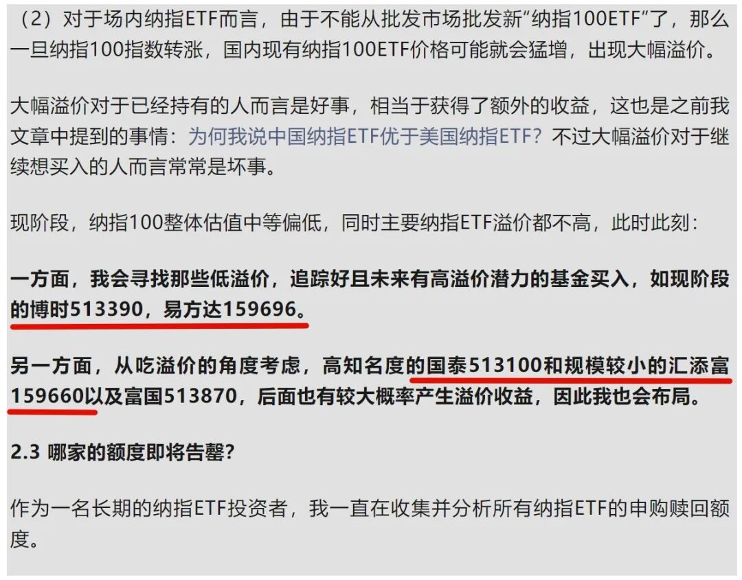 就像之前我5月份写的文章一样,提前布局可能更早产生更高溢价率的纳指ETF产品。等该产品上涨之后,切换到其他低溢价的优质产品,让溢价落实。