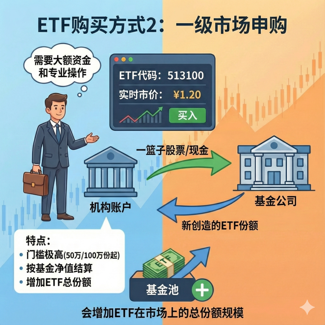 这通常是机构或大资金投资者的玩法,投资者直接向基金公司申请,用“一篮子股票”(实物)或现金来换取新创造的ETF份额。