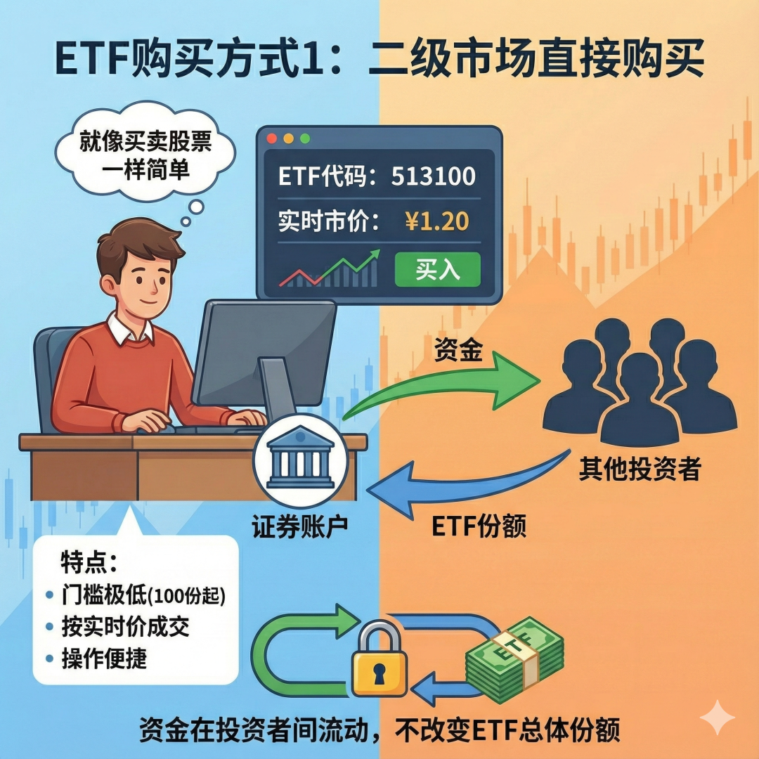 就像买卖普通股票一样,通过证券账户在交易所直接从其他投资者手中购买已有的ETF份额。