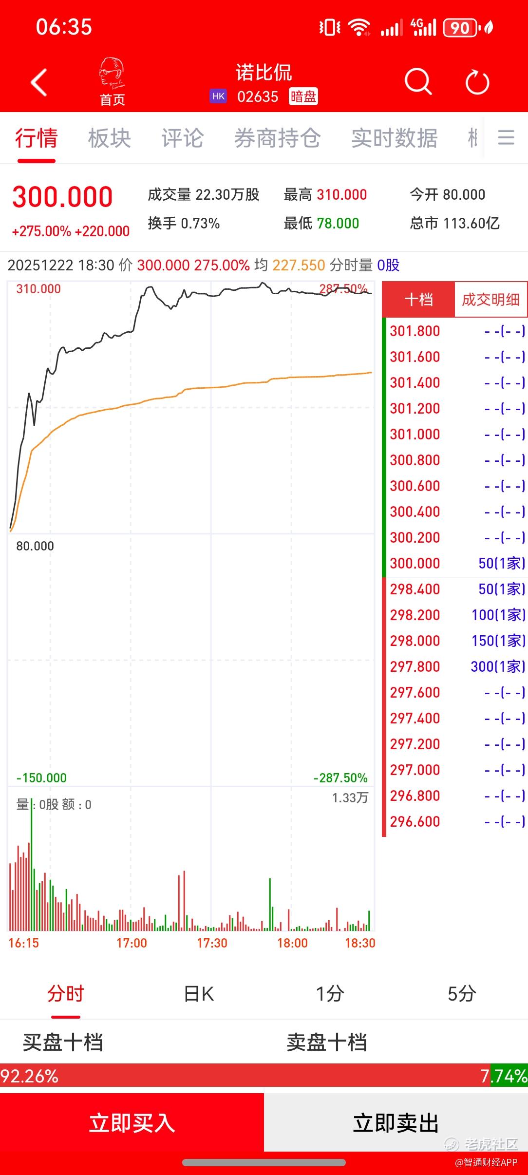 智通财经APP获悉,诺比侃(02635) $诺比侃(02635)$ 将于2025年12月23日(星期二)在香港挂牌。截至收盘,利弗莫尔证券暗盘交易显示报价300港元,较招股价80港元上涨275%,每手50股,不计手续费,每手赚11000港元。