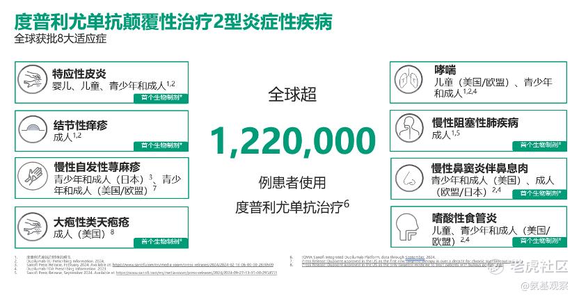 截至目前,度普利尤单抗已在全球60多个国家获得一个或多个适应症的监管批准,惠及超100万名患者,人群涵盖全年龄段(从6个月婴儿到老年人),在8个不同适应症领域积累了长达8年的真实世界数据。