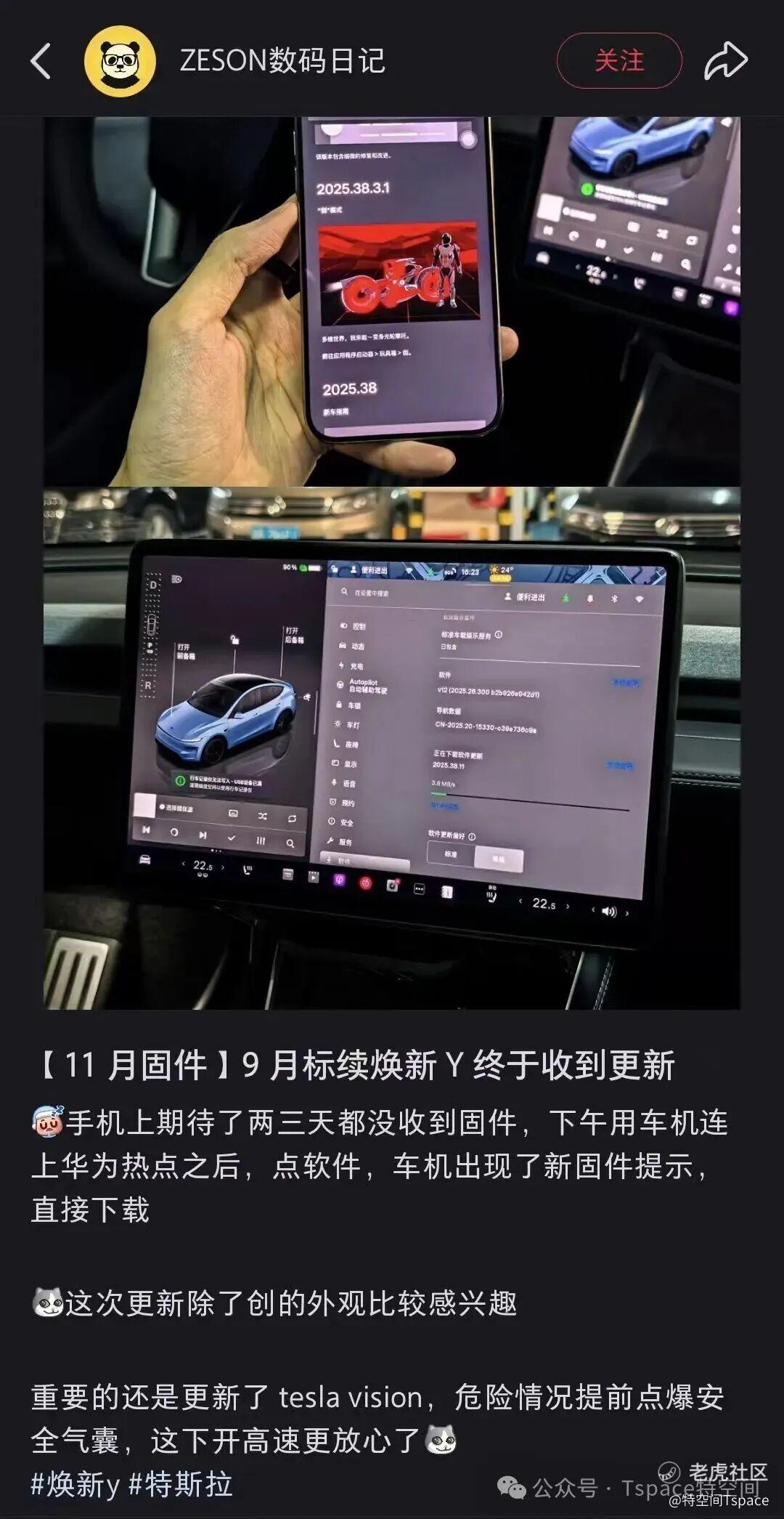 车主@ZESON数码日记 近期完成一次OTA远程软件升级后,兴奋分享:“这次升级最重要的还是更新了Tesla Vision,识别危险情况尽早弹出安全气囊,这下开高速更放心了。”