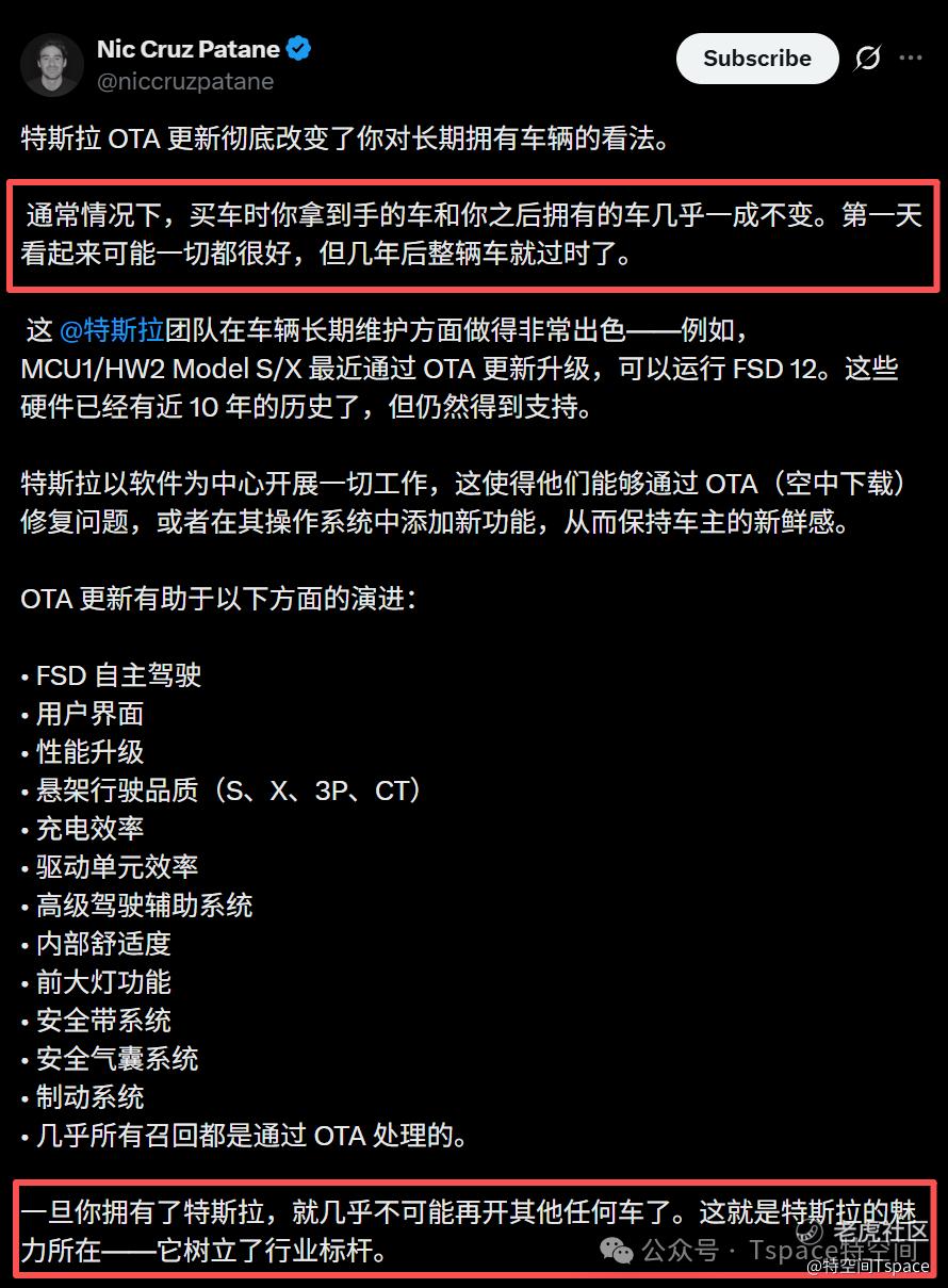 特斯拉OTA远程软件升级,让海外博主@niccruzpatane 直呼“改变了自己对长期拥有车辆的看法”:“燃油车几年后就过时了,而特斯拉可以通过OTA不断进化。一旦你拥有了特斯拉,就几乎不可能再开其他任何车了”