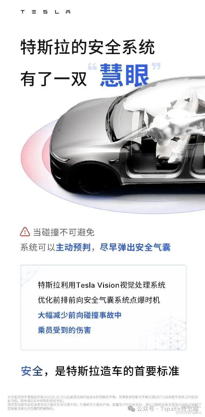 传统燃油车的气囊只能在撞击发生后的瞬间弹出,而特斯拉利用 Tesla Vision视觉处理系统,在发生碰撞的一瞬间,系统会尽早弹出安全气囊以保护驾驶员和副驾驶位的乘客。