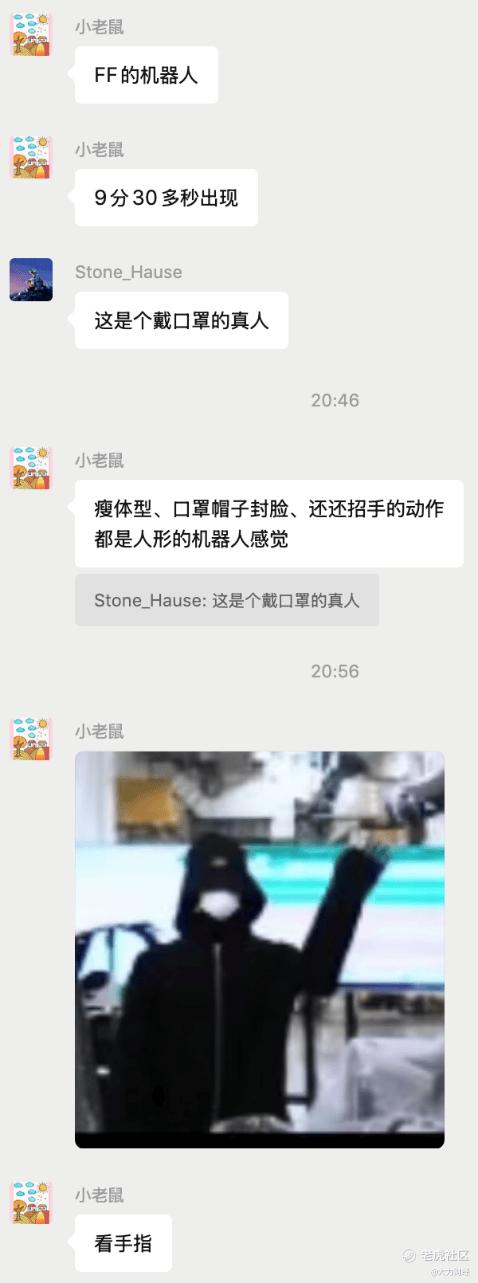 据了解,机器人画面片段出现在FX Super One预量产车下线视频的9分30秒左右。暂停视频,会发现该机器人酷似真人。从其戴着口罩,身形纤瘦,招手的动作来看,应该是人形机器人。之后,该机器人被网友发现后,被截图放到朋友圈、股吧等社交平台上,在网络上引来了热议。这个画面也成为FF进入机器人赛道的铁证。