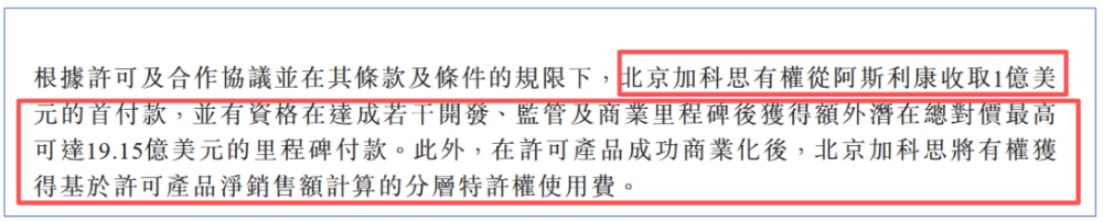 加科思将获得1亿美元首付款,潜在里程碑付款19.15亿美元。