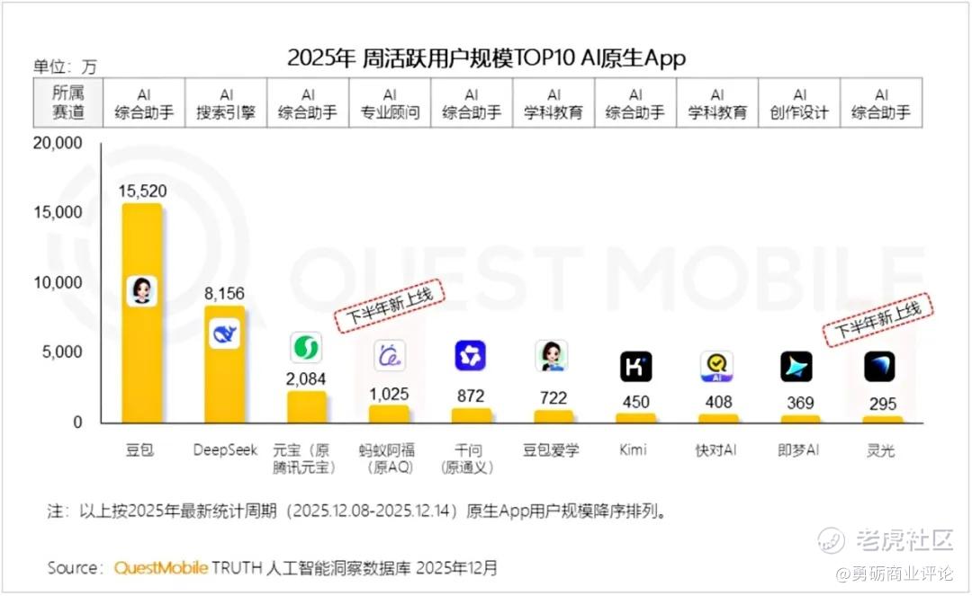 数据显示:全市场AI原生App中,最新周活跃用户排名前四的是豆包、DeepSeek、元宝、蚂蚁阿福,阿里千问位列第五,蚂蚁集团11月发布的通用AI助手灵光,进入前十。