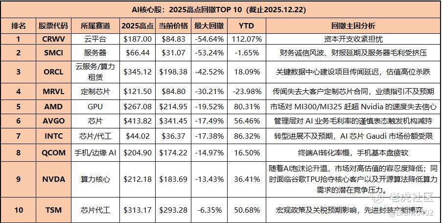 以下是我们整理出的2025从高点回撤TOP 10的AI核心股: