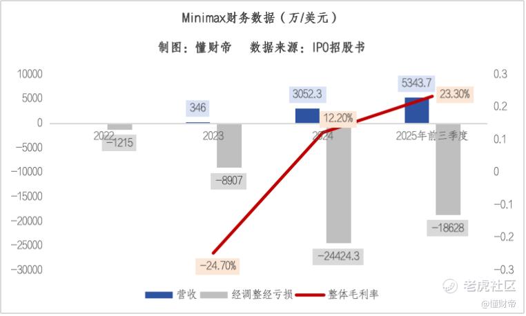 净利润方面,MiniMax已进入高质量、可持续的增长阶段。在营收大幅翻倍情况下,经调整净亏损整体呈现收窄趋势。2022-2024年,以及2025年前三季度,经调整亏损分别为1215万美元、8907万美元、2.44亿美元,及1.86亿美元。