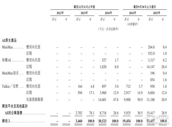 招股书显示,MiniMax成立第二年即2023年就实现营收,当年收入为350万美元;2024年,这一数字跃升至3050万美元,同比增幅高达782%;2025年前九个月,收入继续增长至5340万美元,同比增长超过170%。