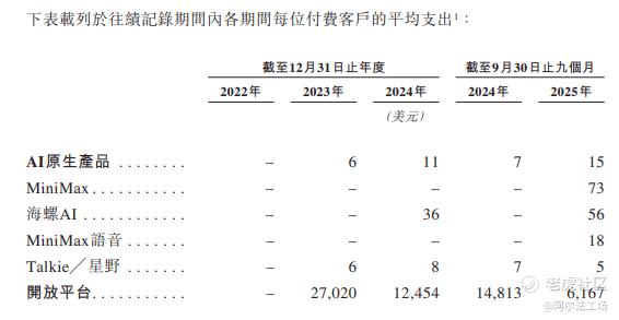 除上述两款产品外,MiniMax的智能Agent应用虽然用户基数相对较小,但展现出极强的商业溢价能力。2025年前9个月,其每位付费客户的平均支出高达73美元,显著高于Talkie/星野的5美元,体现出公司在AI生产力工具方向的变现潜力。