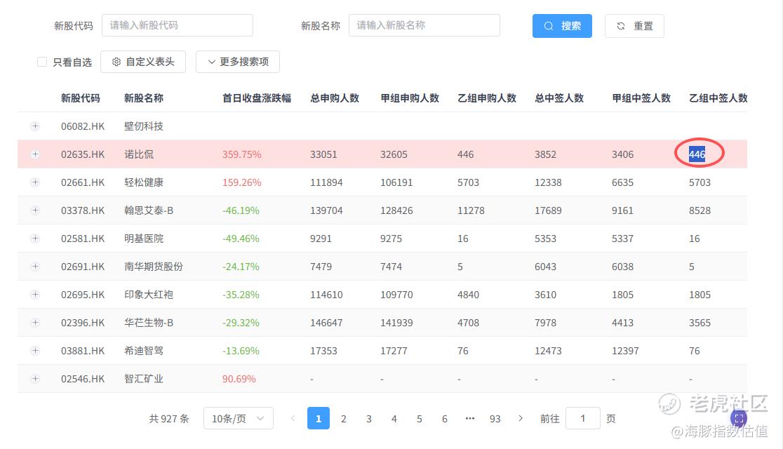 反倒是最不受人待见的 $诺比侃(02635)$ ,只有三万人申购,乙组只有446人申购,这波赢麻了。乙头中签两万多元,涨幅359%,在上市之前,大家伙都以为这446人要亏麻,突然冰火两重天了,不知道是什么感觉。