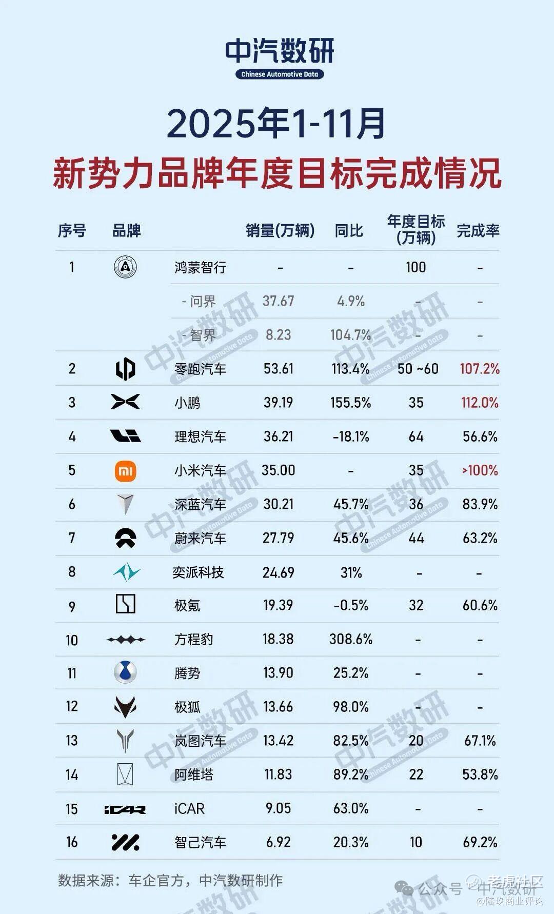 按照中汽数研公布的数据,深蓝汽车1-11月的年度目标完成率为83.9%,在新势力品牌中表现尚可,如果基于11月的销量规模以此推测,完成36万的目标具备可能性。