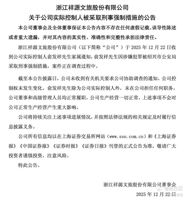12月22日晚,祥源文旅(600576.SH)、交建股份(603815.SH)与海昌海洋公园(2255.HK) 三家公司,几乎同时发布了一份内容几乎相同的公告:公司实际控制人、祥源控股集团董事长俞发祥因涉嫌犯罪,已被绍兴市公安局采取刑事强制措施,案件正在调查过程中。