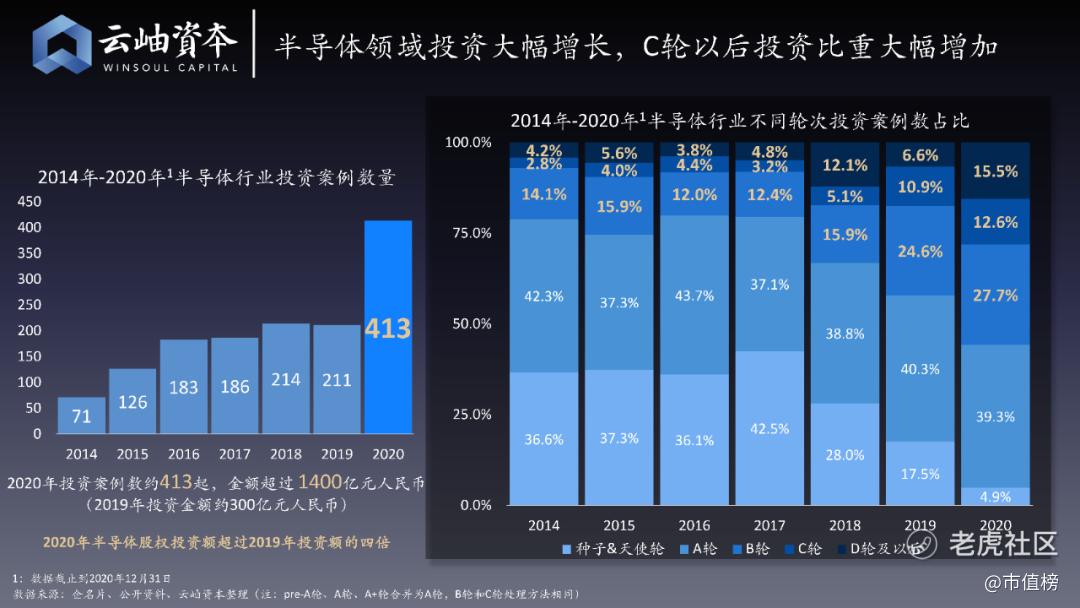 据云岫资本《2020年中国半导体行业投资解读》的统计,2020年半导体行业股权投资案例413起,投资金额超过1400亿元人民币,相比2019年约300亿人民币的投资额,增长近4倍,这也是中国半导体一级市场有史以来投资额最多的一年。