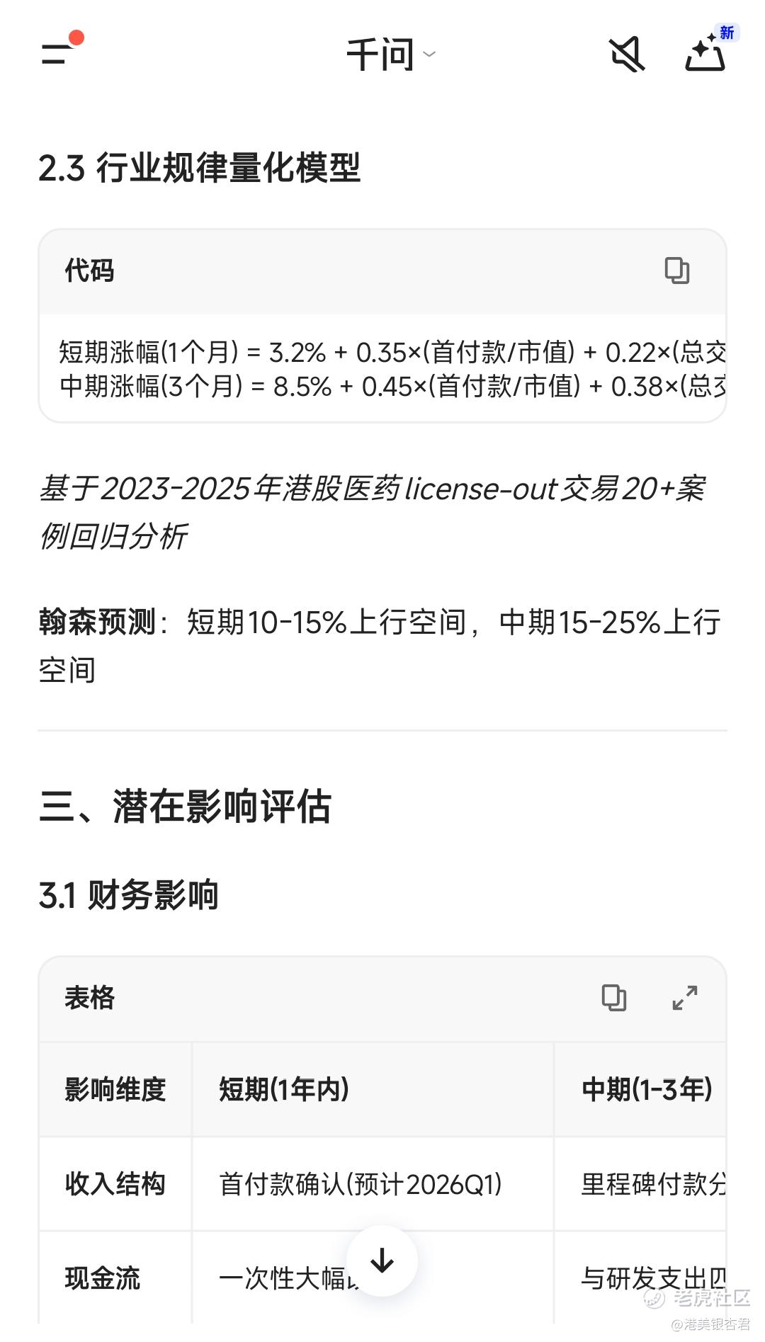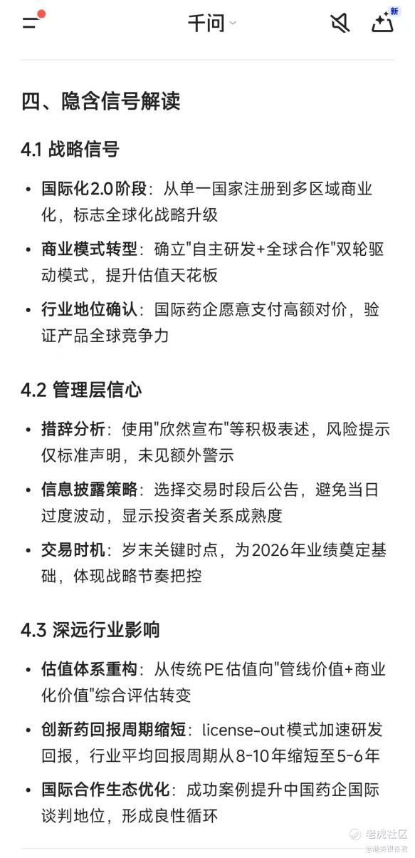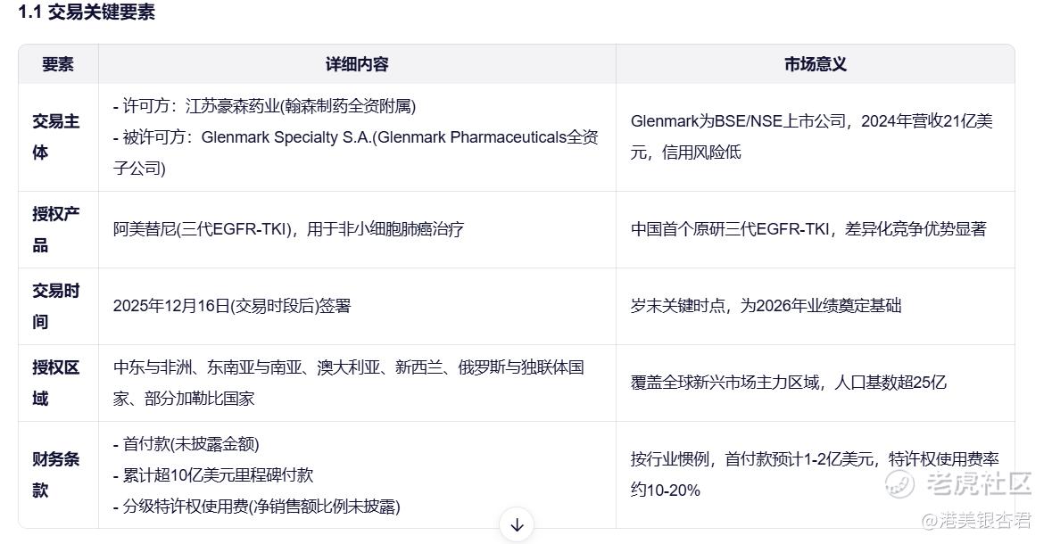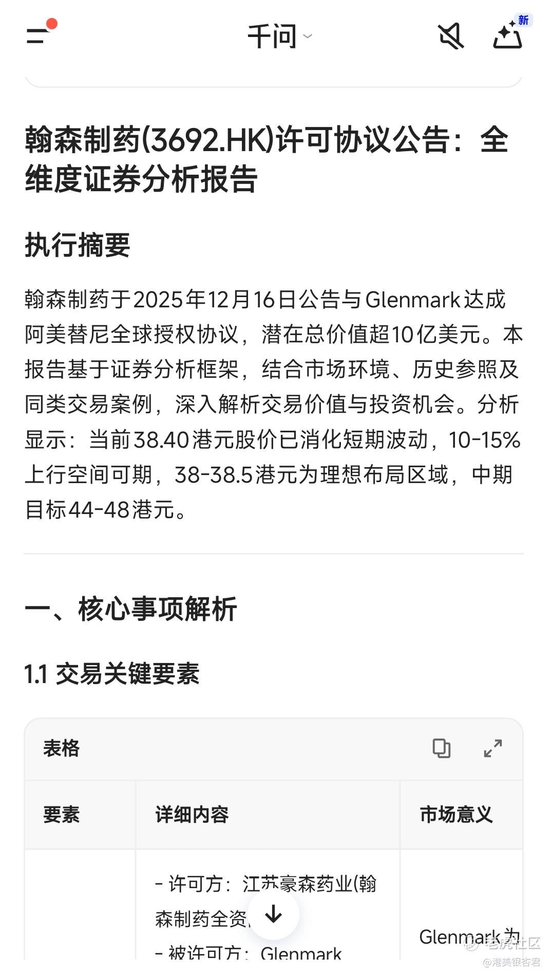 这个实际上,很多球友也有提到过,说明AI是整合了大家的分析,最后进行了有效的总结,同时还特别指出,因为交易细节未明,短期业绩贡献有限,但是这次翰森制药license-out模式价值被低估,如果首付款+里程碑进一步明确的话,将显著改善2026—2027年现金流,38港元附近是中长期价值布局良机。