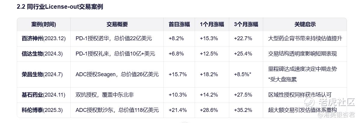 而在同行业License-out交易案例,将几个时间段的重大BD都进行了详尽的市场交易分析,并给出了关键启示。