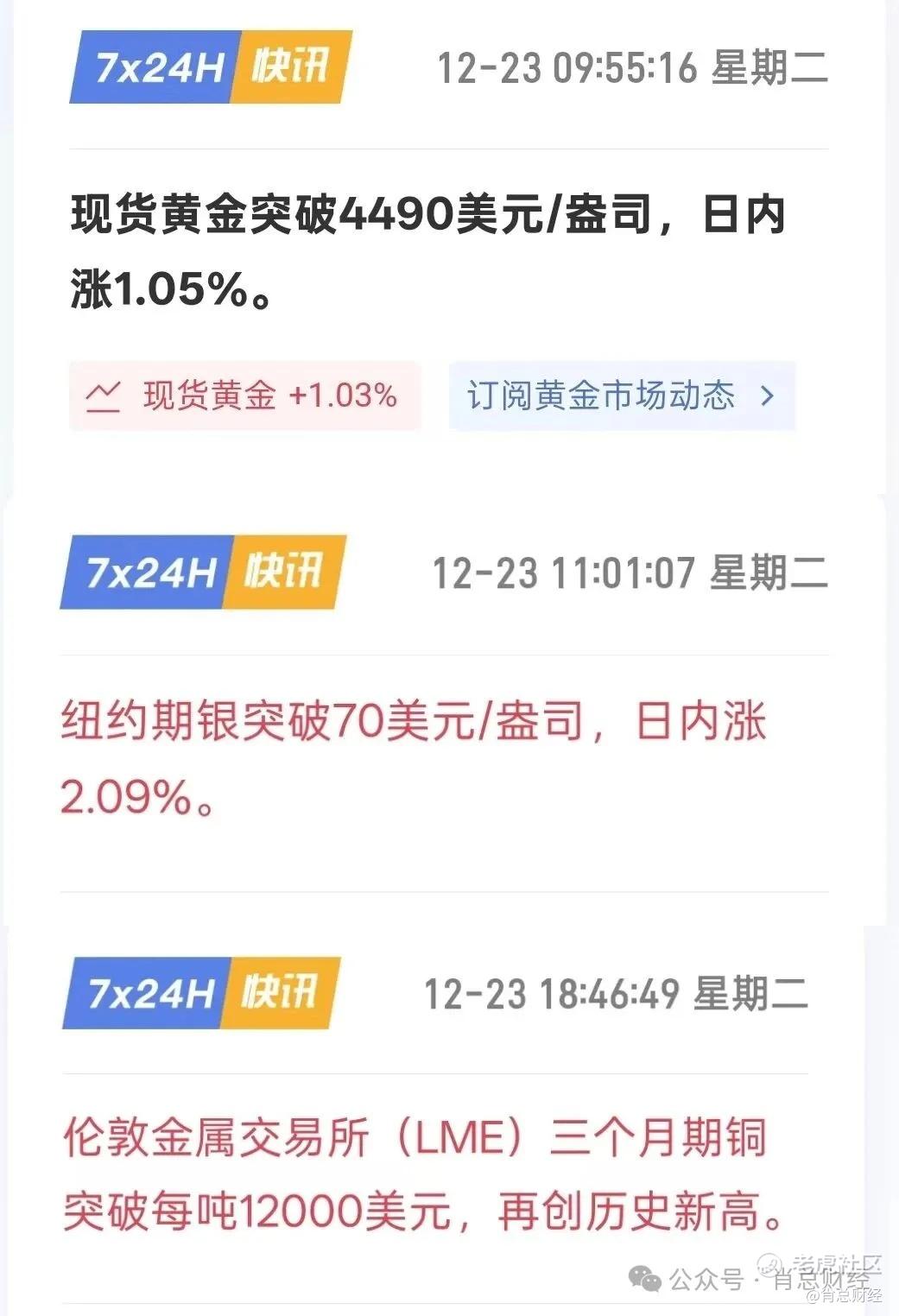 白银升破70美元破新高;黄金也站上4480美元/盎司;伦铜突破每吨12000美元创新高。