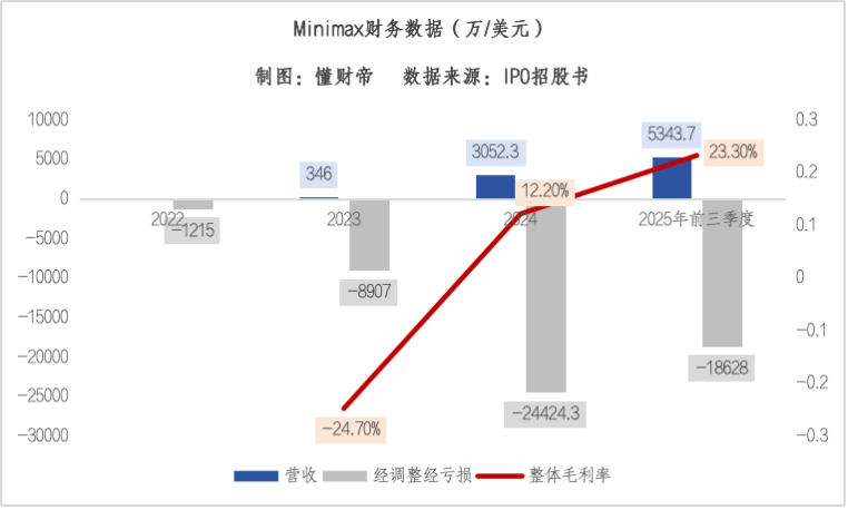 净利润方面,MiniMax已进入高质量、可持续的增长阶段。在营收大幅翻倍情况下,经调整净亏损整体呈现收窄趋势。2022-2024年,以及2025年前三季度,经调整亏损分别为1215万美元、8907万美元、2.44亿美元,及1.86亿美元。