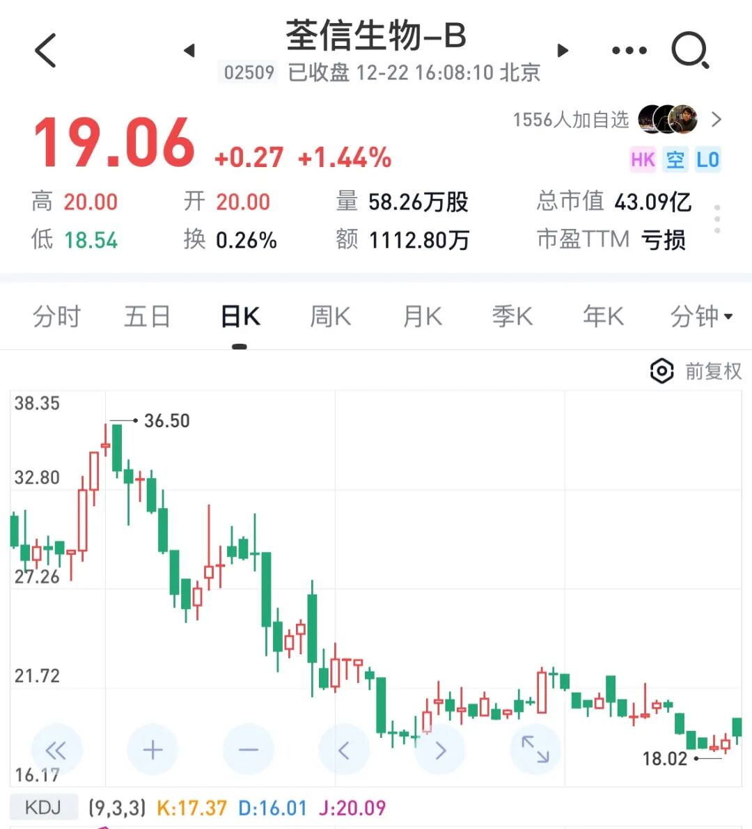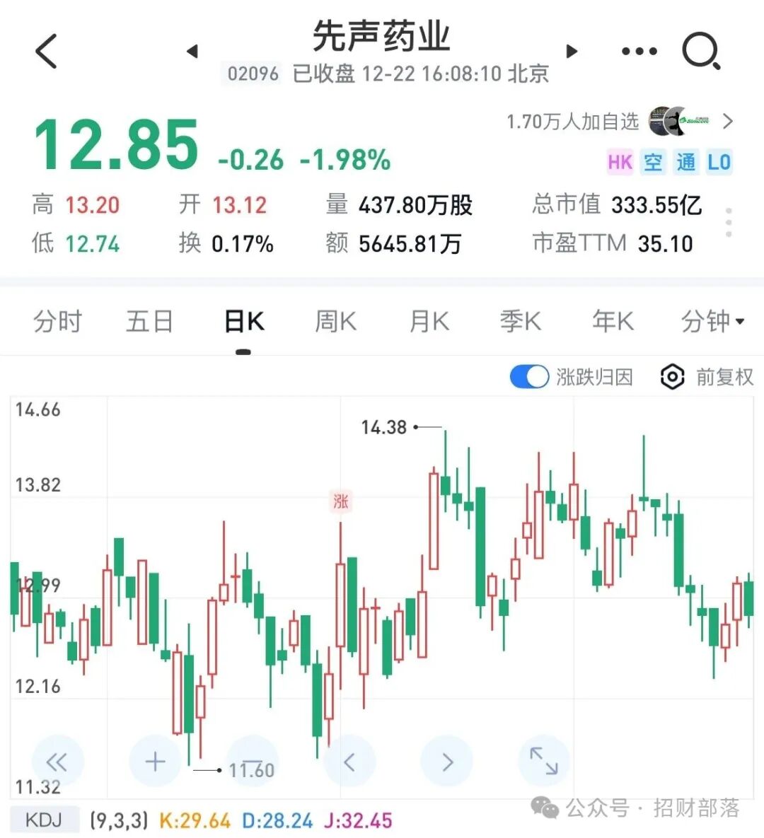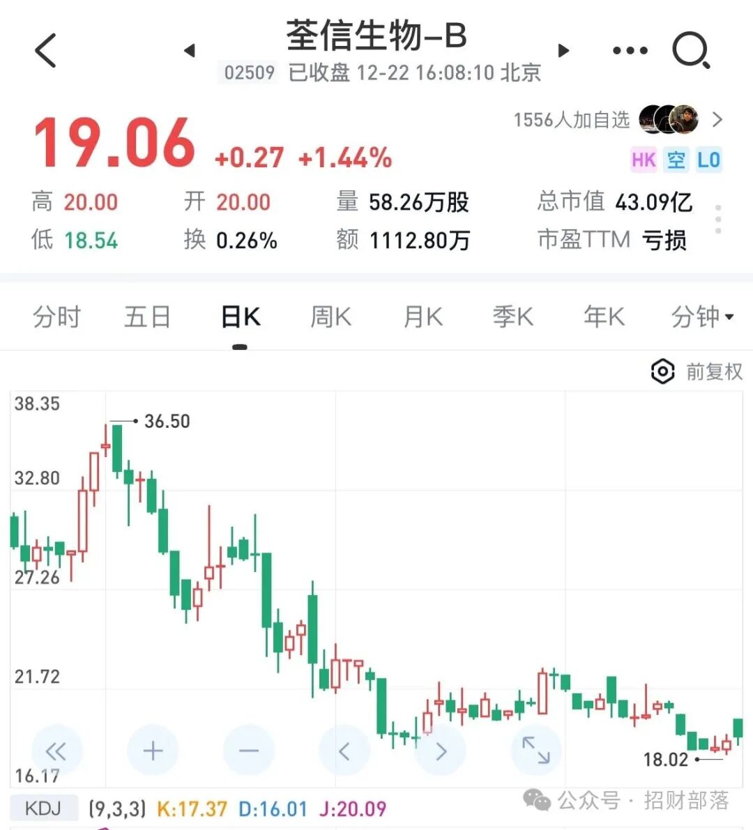 1、华荏生物IPO首日暴跌,这大概是最惨的港股18A新股了吧 港交所今年发了114只新股,融资2863亿港元,融资规模全球第一,到了年底韭菜终于还是扛不住了。同样下跌的还有今天IPO的其他三只,明基医院跌49%、印象大红袍跌35%、南华期货股份跌24%。 2、加科思大跌14%,1亿美元首付款,20.15亿美元总交易金额 还处于临床1期的JAB-23E73为一款pan-KRAS之抑制剂除中国外的全球权益授权给阿斯利康,首付款拿到1亿美元却支棱不起股价。 3、先声药业跌2%,4500万美元首付款,10.6亿美元交易总金额 先声药业的靶向LRRC15的抗体药物偶联物(“ADC”)SIM0613在大中华区以外地区的全球权利授权给益普生Ipsen,BD利好出也遭遇了收跌命运。 4、荃信生物微涨1.44%,7亿美元总交易金额 荃信生物的QX027N长效抗TSLP/IL-13双特异性抗体大中华区以外地区的全球权利授权给Windward Bio Group,总额高达7亿美元的付款,包括首付款、Windward Bio的股权、开发及商业里程碑付款,以及未来的销售分成。 看月K线,今年的创新药涨的还不错,年底圣诞元旦该放假放假,资金无心恋战是主要因素; 资金结构也发生了变化,这波港股18A涨幅主要有内地的南下资金推动,关注短期波动和交易机会,长期资本参与不多; 获利盘止盈,港股18A反弹至今,港股通创新药指数从去年底部都涨了3倍,获利盘落袋为安不折腾了。