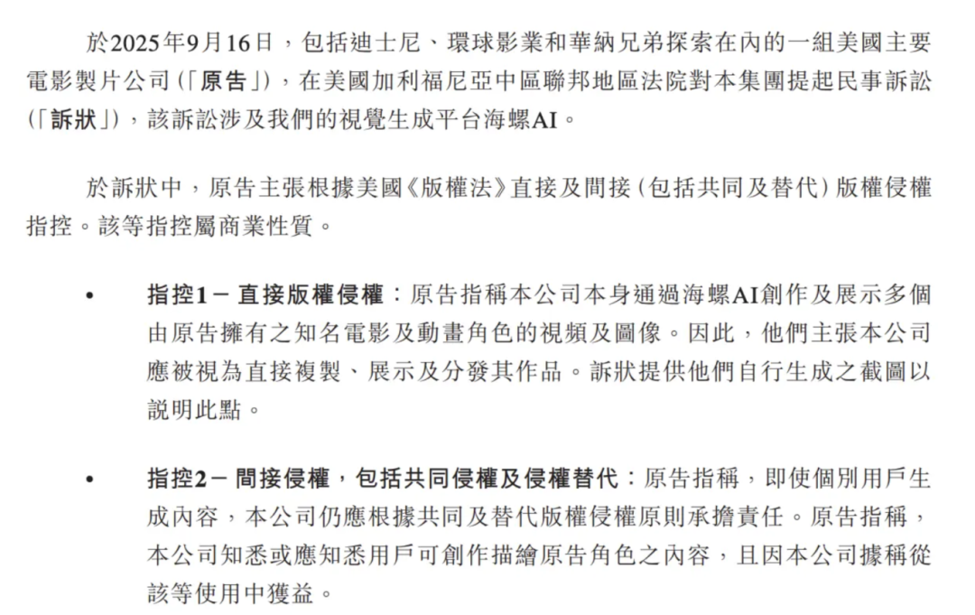更严峻的是,2025年9月,MiniMax遭迪士尼、环球影业、华纳兄弟等众多家好莱坞公司起诉,19页起诉书直指MiniMax的图像和视频生成服务“海螺AI”侵权,此次诉讼若败诉,可能导致海螺AI被迫下架,对MiniMax海外业务造成重大冲击。