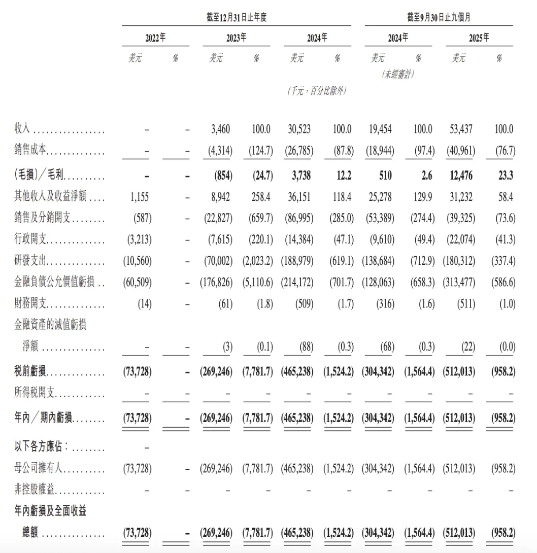 在招股书中MiniMax坦言,预计2025年全年净亏损仍将显著增加,主要原因是持续的研发开支投入。实际上,在招股书时间内,MiniMax的研发费用累计高达4.50亿美元。其中,2024年研发费用高达1.89亿美元,同比增长169.98%;2025年三个季度研发费用就已经来到了1.80亿美元,同比增长30.02%。